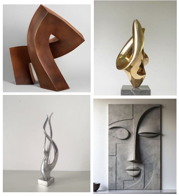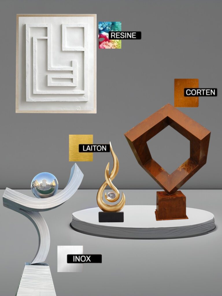 l’acier Corten , l’inox ,le laiton, l’aluminium, la résine, le bois, ou encore le métal peint.